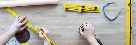 professional builder work with house renovation instruments on wooden background top view