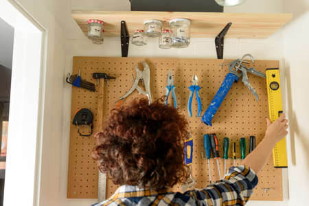 Various working tools hanging on wooden board in workshop.