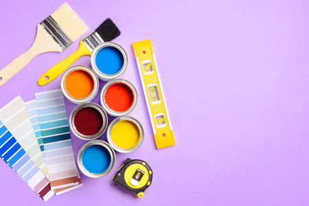 Cans of paints and tools on color background
