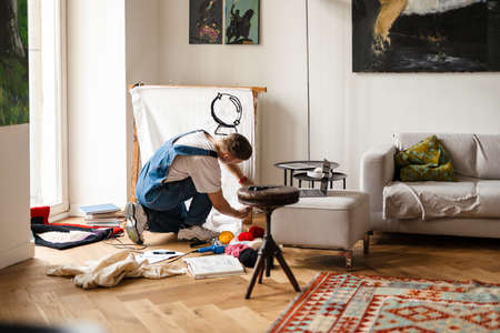Young white man wearing overall working on craft rug at home