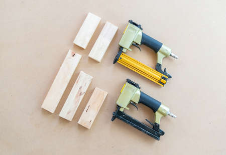 Air gun nail lying on wood and pile of wood. in workshop. Pneumatic and air tool.