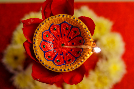 Close up clay lit light a fire already on Diya or oil lamp with flowers, studio shot on concrete background, Decoration of Hinduism rangoli, Happy celebration Deepavali or Diwali Indian festival concept