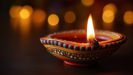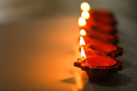 Happy Diwali - Clay Diya lamps lit during Dipavali, Hindu festival of lights celebration.
