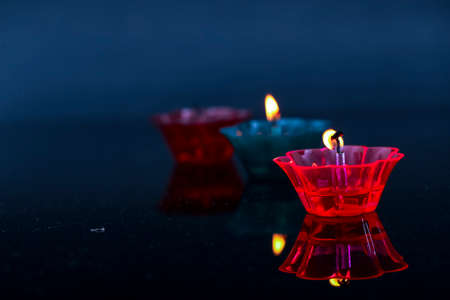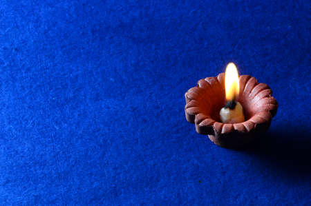 Happy Diwali - Clay Diya lamps lit during Diwali, Hindu festival of lights celebration. Colorful traditional oil lamp diya on blue background