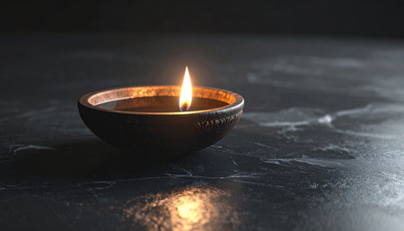 A single diya flame casts a warm glow in a dark room, creating deep shadows and a spiritual, minimalistic ambiance. The light symbolizes hope and tranquility.