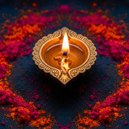 A beautiful diya emits a warm light, surrounded by vibrant colored powders. The festive atmosphere captures the essence of celebration, joy, and tradition during Diwali night.