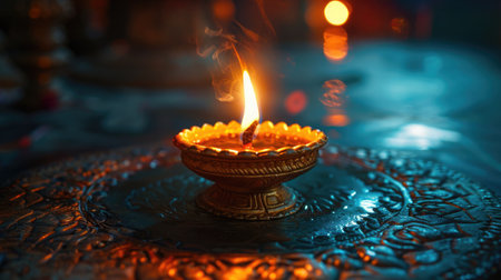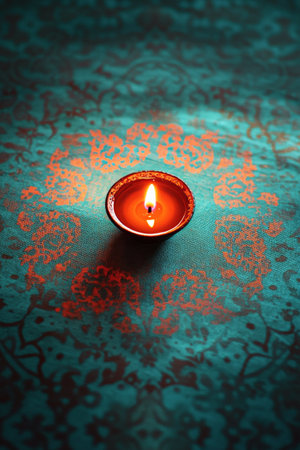 A traditional diya emits a warm glow against an intricately patterned turquoise fabric. This serene atmosphere adds a festive touch to the vibrant surroundings, perfect for celebrations.