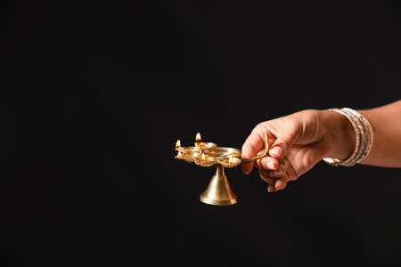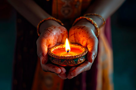 Diwali Festival of lights celebration. Diya lamp in woman hands, close up