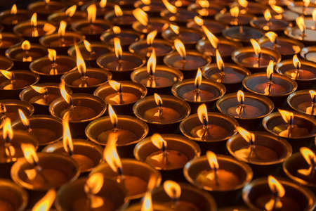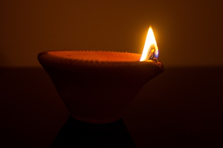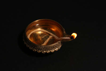 Traditional clay oil lamp lit with bokeh background. Selective focus.