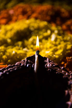 Traditional diya or oil lamp lit on colorful rangoli made up of marigold flower petal, on the festival of lights called diwali or deepawali, selective focus