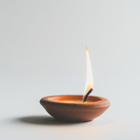 A powerful moment of ignition: hands light a traditional oil lamp, symbolizing hope and victory of light over darkness. The warm glow creates a serene, spiritual atmosphere.