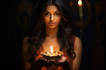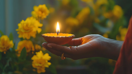 Indian Woman Holding a Lit Diya Lamp During Basant Panchami. Concept of Cultural Traditions, Spiritual Celebrations, Festival of Lights, and Heritage.. Copy space.