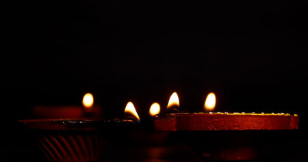 Diya lamps lit during Diwali celebration on black background. Happy Diwali,