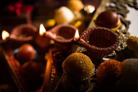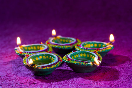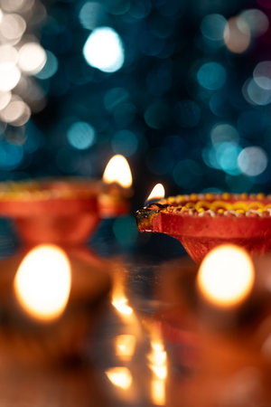 Traditional Diwali Diyas are illuminated with vibrant colors on the bokeh background during the festival of Diwali.