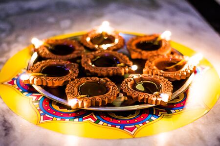 Diya in Thali - Brass Plate or thali full of Terracotta diya or oil lamps ready for decorating or illuminating house on diwali, a festival of light. selective focus