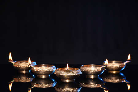 Many lit diyas on black background, space for text. Diwali lamps