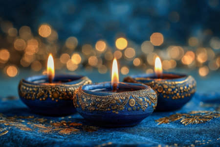 Elegant blue and gold oil lamps with glowing flames set a serene, celebratory mood, their intricate designs enhancing a cozy, festive atmosphere with a gentle, blurred ba