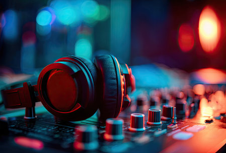 A pair of headphones rest on top of a mixing console, illuminated with vibrant red and blue lighting. The image captures the equipment commonly used in audio production, with a focus on details and textures. Suitable for illustrating music, sound engineering, or creative technology concepts in various commercial contexts.
