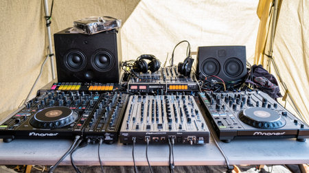 Sound mixing board and DJ equipment set on a table at an empty festival booth