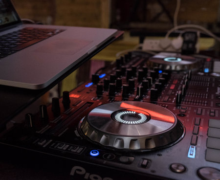 Disc Jockey mixing deck and turntables at night controls for mixing music for a party or disco
