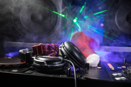 Dj mixer with headphones on dark nightclub background with Christmas tree New Year Eve. Close up view of New Year elements on a Dj table. Holiday party concept. Empty space