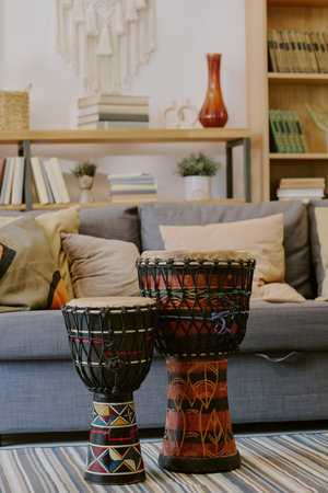 Two traditional drums standing on striped rug in living room setting, symbolizing Kwanzaa celebration with cultural decor and bookshelf in background