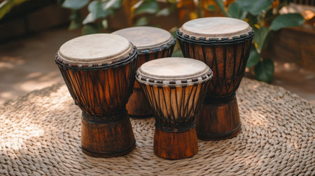 Two handcrafted drums rest atop a natural fiber rug, illuminated by soft sunlight casting intricate shadows, creating a serene and artistic atmosphere.