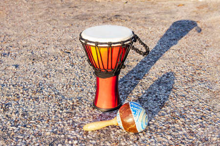 African percussion instrument djembe and marocas on the sand near the ocean. National African and Latin American exotic percussion instruments at the carnival for creating rhythm, dancing, meditation