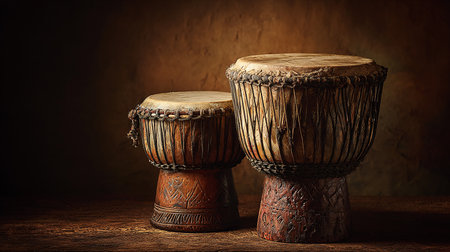 Two traditional African drums made of wood, showcasing unique textures and colors, placed on a wooden table. The soft lighting enhances their artistic qualities, perfect for themes of music and cultural celebration.