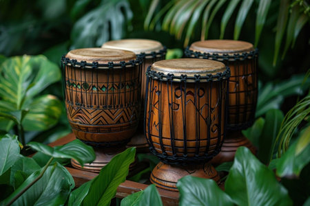 Pair of ornate african djembe drums against a backdrop of vibrant green foliage
