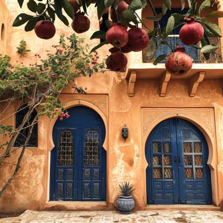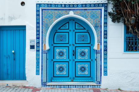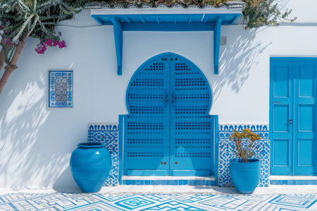 A striking electric blue building with a white facade, featuring a beautiful azure door. The symmetry of the arabic, turkish architecture is enhanced by the arched windows and font