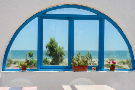 a window of the Prophet Elias Holy Temple, an orthodox church is standing up the hill in a greek landscape