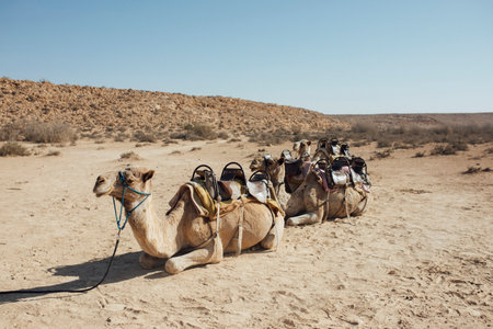 Camels resting in the desert with traditional saddles, captured in natural daylight. A peaceful Middle Eastern landscape showcasing desert wildlife, travel, and adventure.