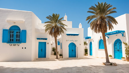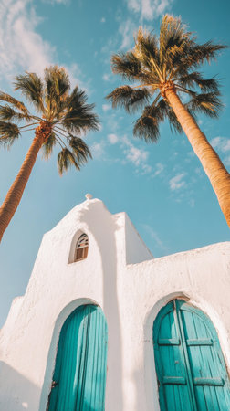 White mediterranean building with turquoise doors and palm trees under blue sky, architectural travel inspiration