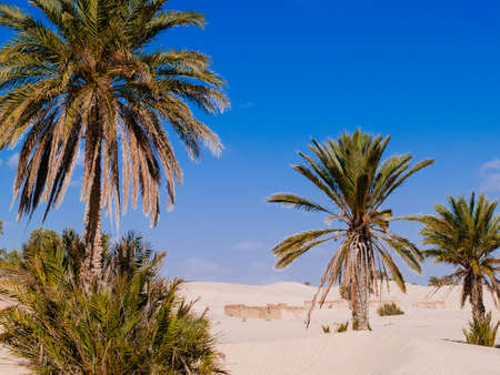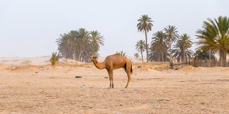 Image of a camel in desert Sahara on background palm trees, Tunisia, Africa