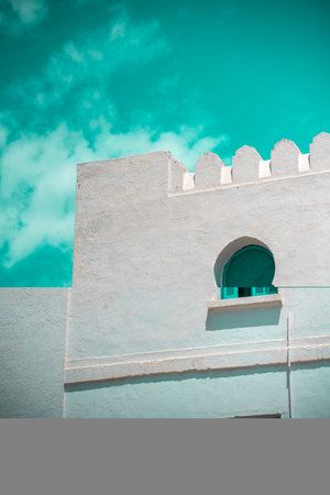 White-blue city of Sidi Bou Said, Tunisia. Eastern fairy tale with a French charm. View of an old historic building, Sidi Bou Said Carthage, Tunisia.