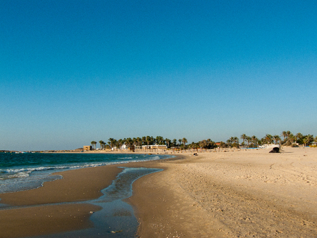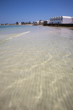Structure of the sand, waves and rays of sunlight. Coast of the Mediterranean sea with buildings of a resort, traditional style with white facade and archs. Djerba, Tunisia, Africa.