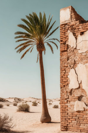 AI Generated. A Palm Tree Stands Beside A Ruined Brick Wall In The Desert