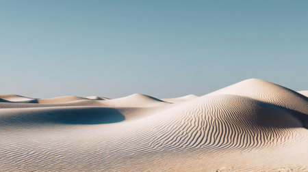 This serene desert landscape features gentle sand dunes under a clear blue sky, showcasing the beauty and tranquility of natural environments in a remote setting.