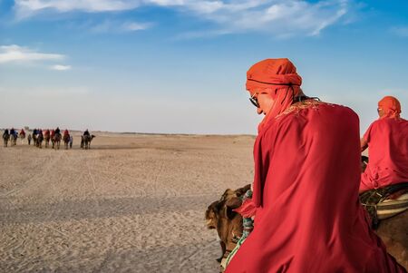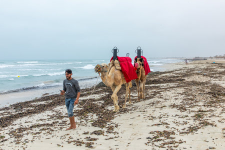 Djerba, Tunisia - April 29, 2024: Man offers camel rides to tourists at the beach of Djerba, Tunisia.