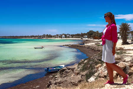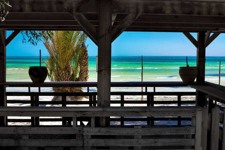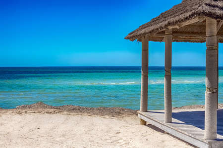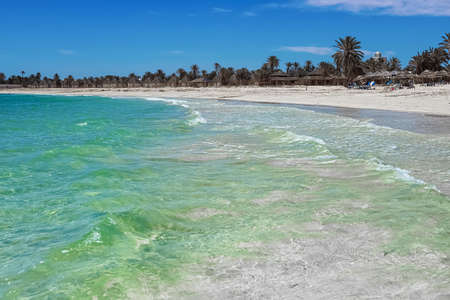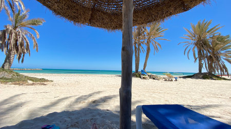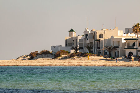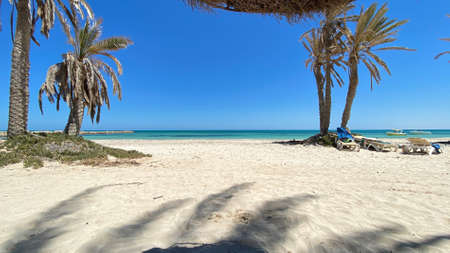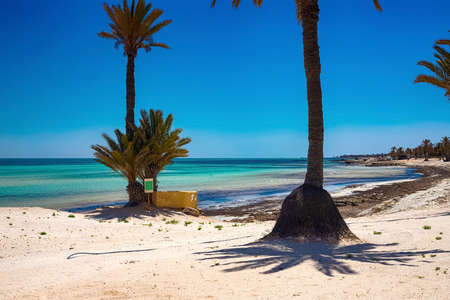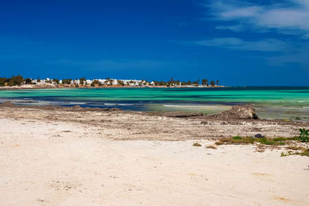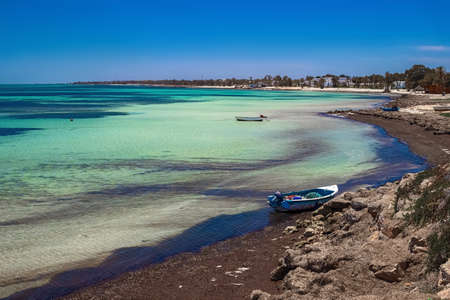 Wonderful view of the lagoon, seashore, white sand beach and blue sea. Djerba Island, Tunisia