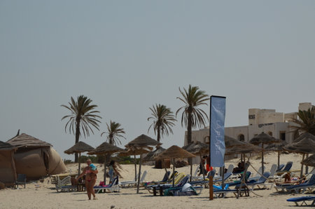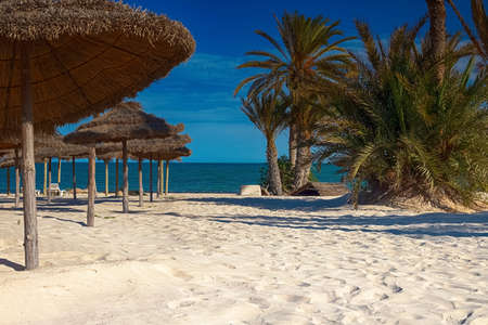 Umbrellas and sunbeds on the beach in Djerba, Tunisia