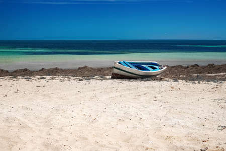 View of an old, wooden boat on the white sand of the Mediterranean coast. Rest at the sea. Djerba Island, Tunisia