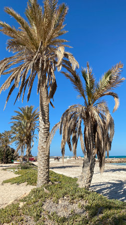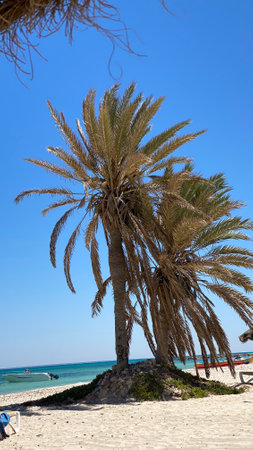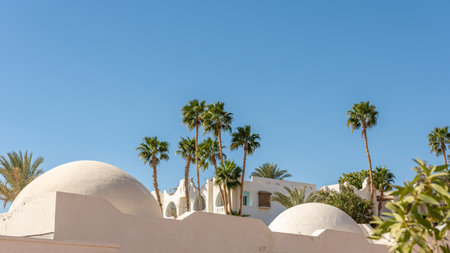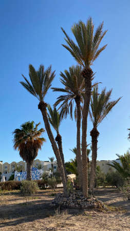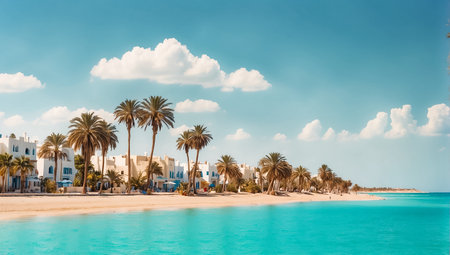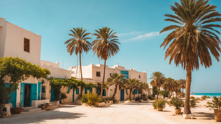White building at the coast. High palm trees. Mediterranean sea in the background. Bright blue summer sky. Djerba, Tunisia, Africa.