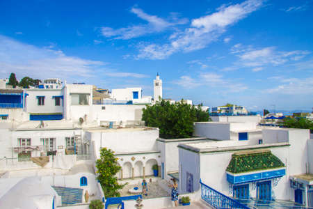 Tunis, Tunisia - 2 Sept, 2014: Sidi Bou Said is famous for the white and blue houses. From the tower is a good view and all tourists want to have the best picure