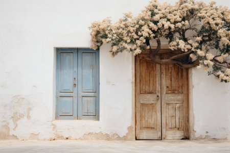 An exterior view showcases a white building with a blue door, adorned by vibrant orange flowers. The composition features clean lines and bright lighting, suggesting a sunny day setting with the ocean in the background. The image's aesthetic is suitable for various commercial uses, including travel and lifestyle content.