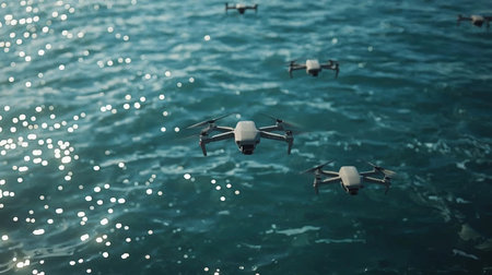 A drone hovers above rippling water, with a soft sunset illuminating the scene. The image displays a shallow depth of field, bringing the drone into sharp focus. The warm colors of the sky blend with the water, creating a tranquil environment. This image could be used for various commercial and editorial projects.