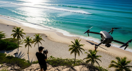 Photographer with drone taking photo of beautiful beach on sunny day.