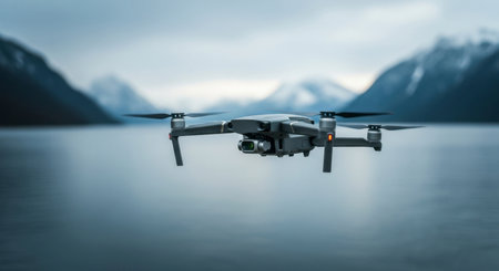 Grey quadcopter drone hovering over calm water with snow capped mountains and cloudy sky. Represents modern technology for aerial photography and videography, capturing stunning landscapes.