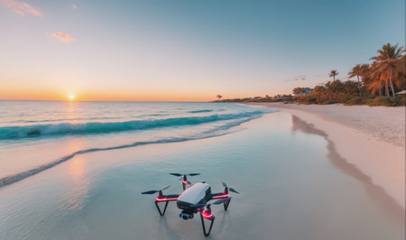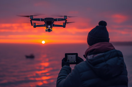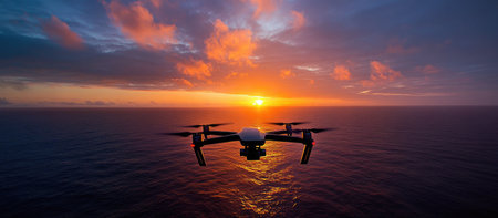 A drone’s camera capturing a breathtaking sunset over the ocean, with its propellers gently whirring. . --ar 16:7 --v 6.1 Job ID: edd095dc-54fb-4428-abbc-7188c125671a